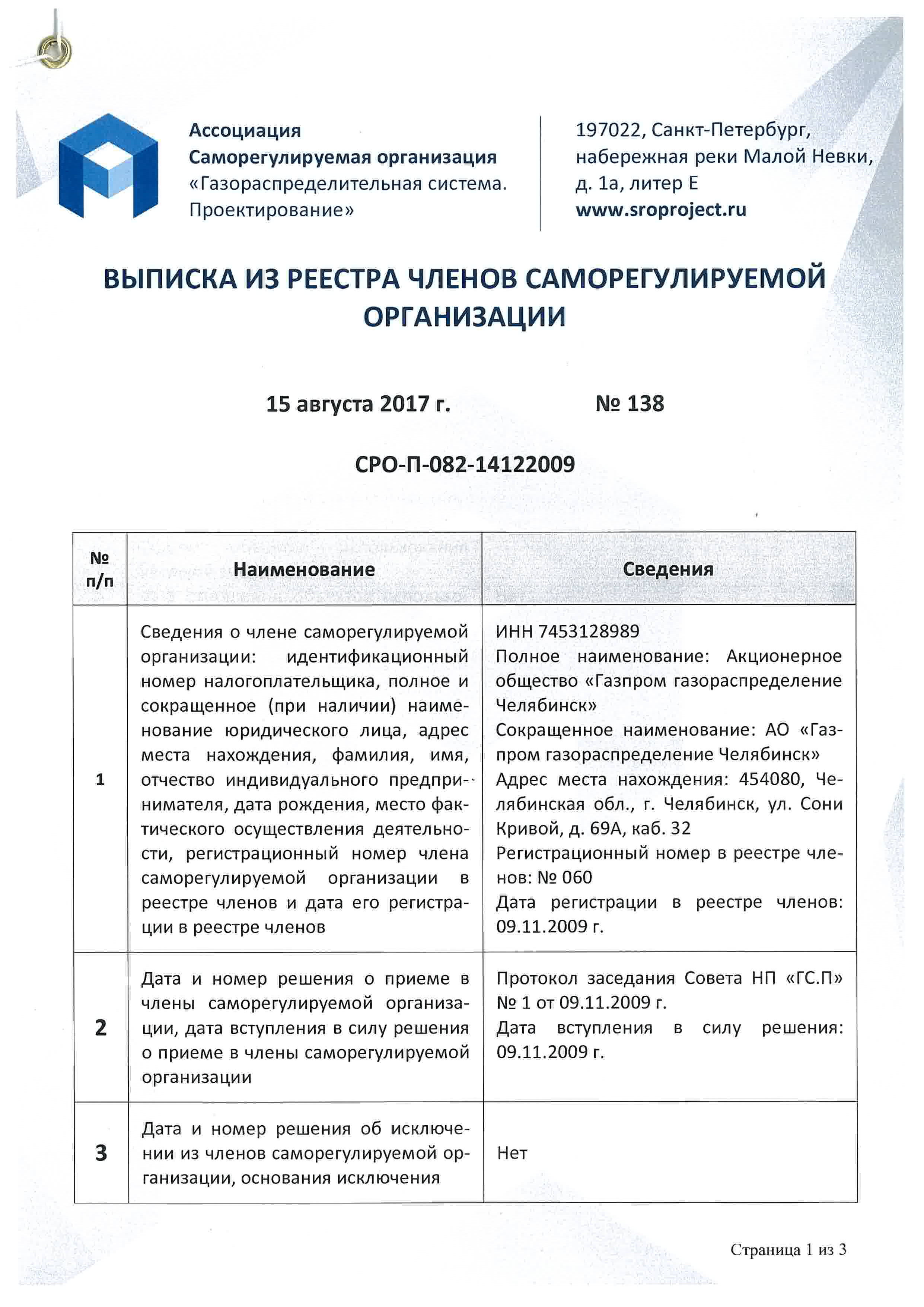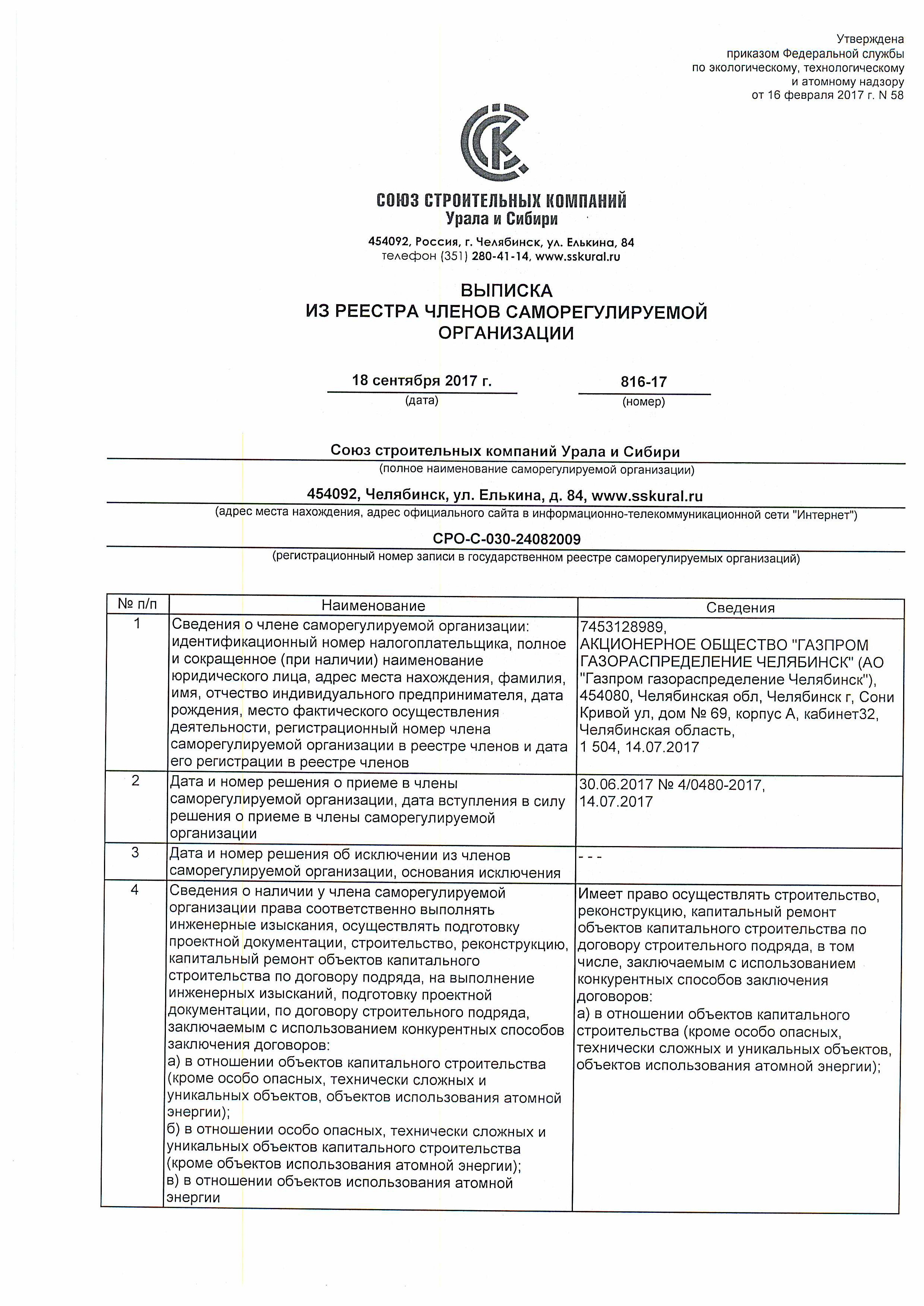 СВИДЕТЕЛЬСТВО АО «Газпром газораспределение Челябинск» о допуске к определенному виду или видам работ, которые оказывают влияние на безопасность объектов капительного строительства
