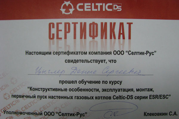 По окончании семинара специалисты компании получили сертификаты, подтверждающие прохождение обучения по курсу «Конструктивные особенности, эксплуатация, монтаж, первичный пуск настенных газовых котлов CELTIC-DS серии ESR/ESC».