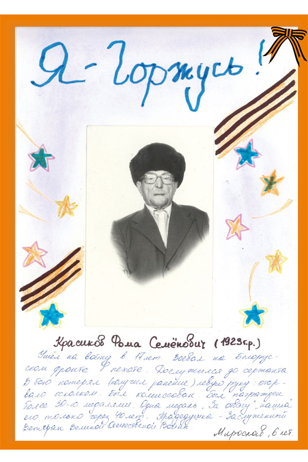 «Я – Горжусь! Красиков Фома Семенович. Ушел на войну в 17 лет. Воевал на Белорусском фронте в пехоте. Дослужился до сержанта. В бою потерял левую руку: оторвало осколком. Был награжден более 30 медалями…»