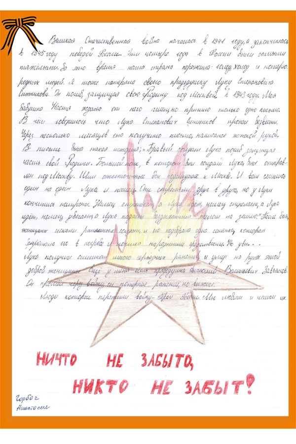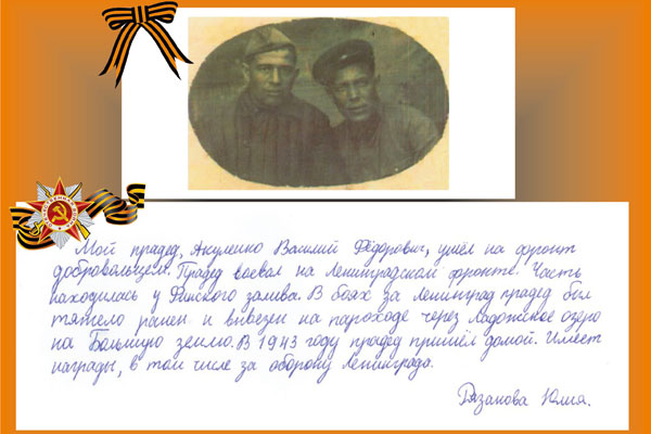 «Мой прадед, Акуленко Василий Федорович, ушел на фронт добровольцем. Прадед воевал на Ленинградском фронте. Часть находилась у Финского залива. В боях за Ленинград прадед был тяжело ранен и вывезен на пароходе через Ладожское озеро на Большую землю. В 1943 году прадед пришел домой. Имеет награды, в том числе за оборону Ленинграда».